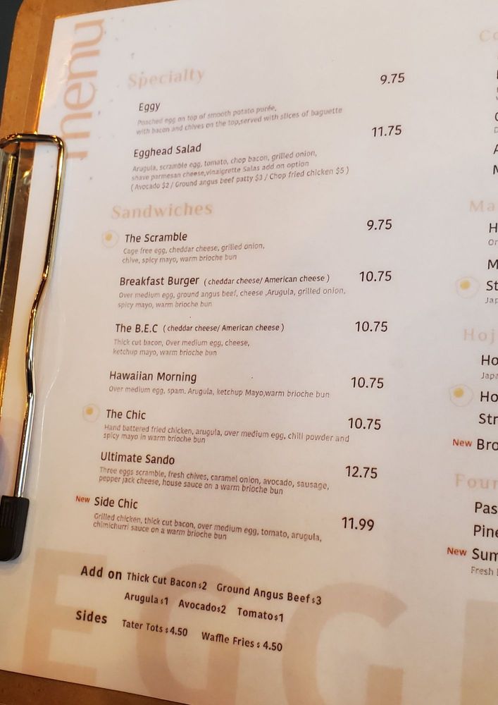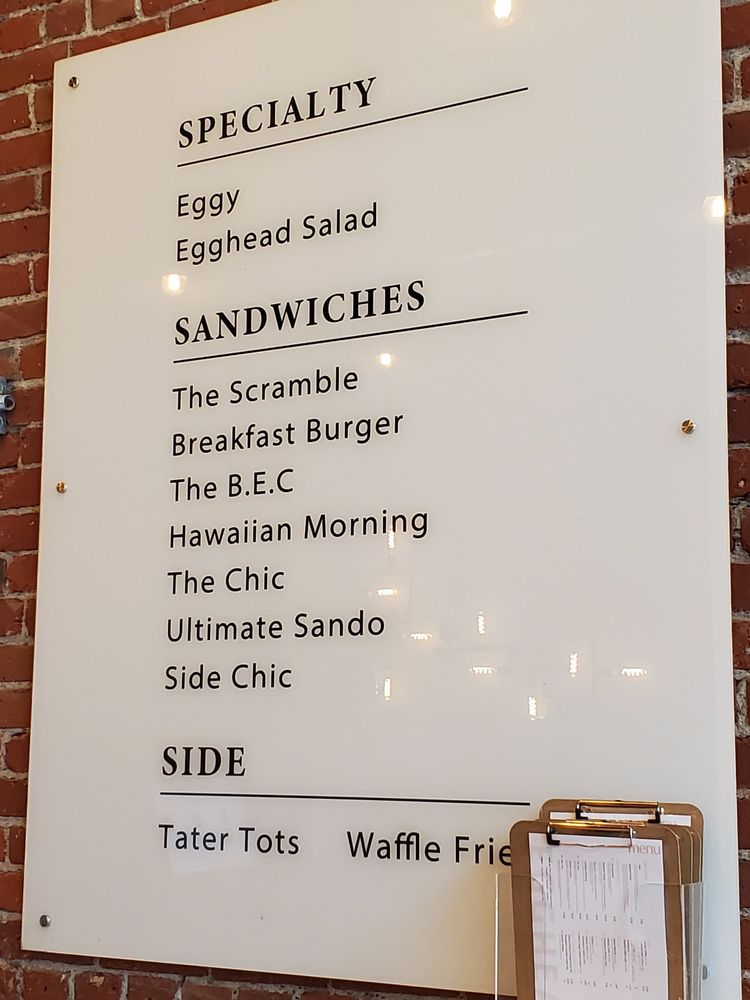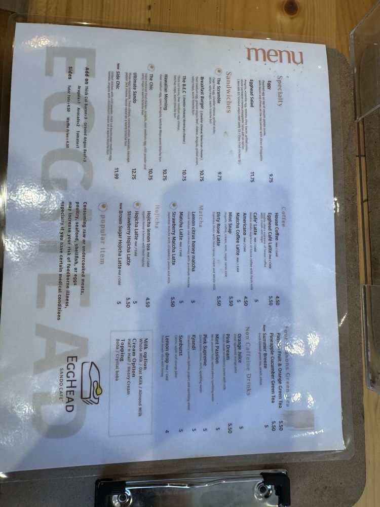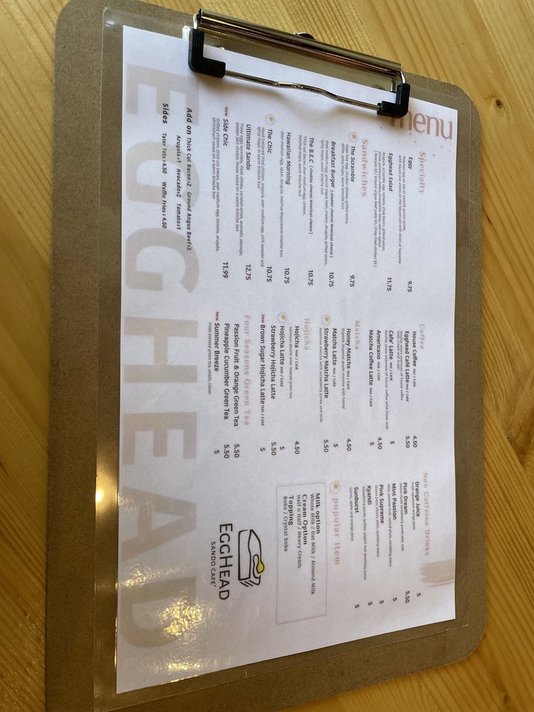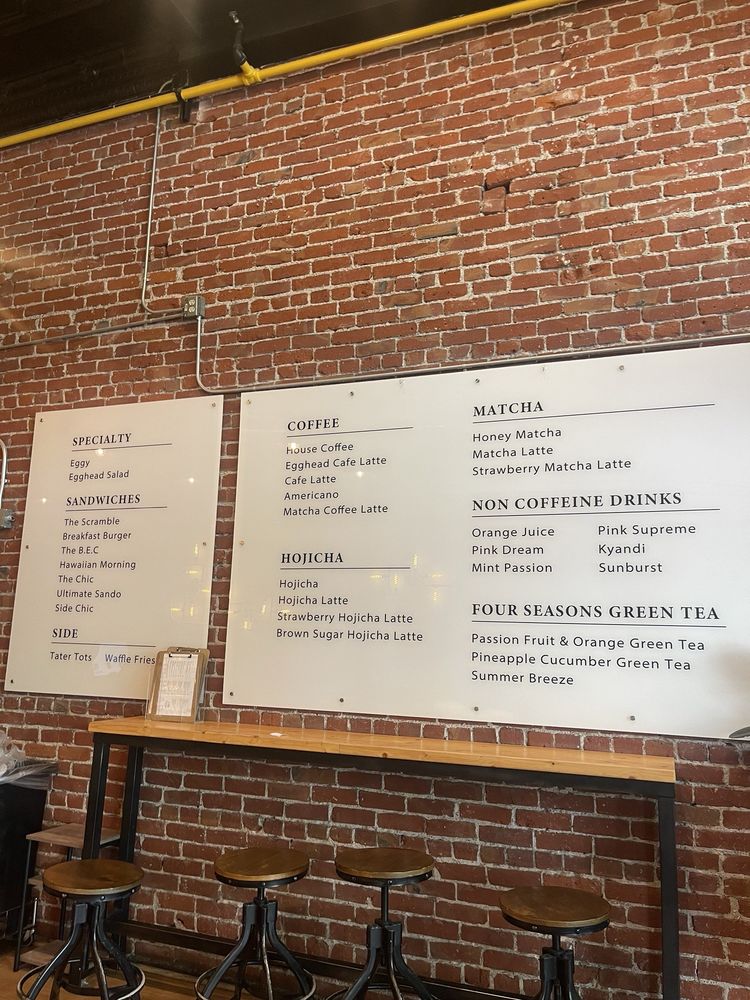 As I introduce Egghead Sando Cafe, located in San Jose, CA, the focus is on their delectable menu offerings. Specializing in egg-centric dishes, the standout items include the Eggy Poached Egg with Smooth Potato Puree and Bacon, the Egghead Salad with Scrambled Eggs and Cheddar Cheese on a bed of fresh vegetables, and a variety of signature sandwiches like The Chic Sandwich, The Ultimate Sando, and the Hawaiian Morning Sandwich. Beverage options range from Honey Matcha and Matcha Lattes to unique creations like the Pumpkin Spice Hojicha Latte. Customers rave about the generous portions, quality ingredients, and the friendly service. With a diverse menu, classy ambiance, and a range of amenities like outdoor seating, delivery options, and gender-neutral restrooms, Egghead Sando Cafe offers a delightful dining experience for breakfast or brunch enthusiasts.